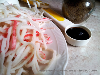 2. Paluszki krabowe rozszczepiamy na kluseczki i tworzymy nasz 'makaron'.